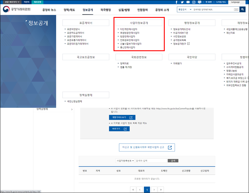 공정거래위원회 사이트(https://www.ftc.go.kr/)에서 [정보공개 > 사업자정보공개] 메뉴를 통해서 상호명 검색이 가능합니다.