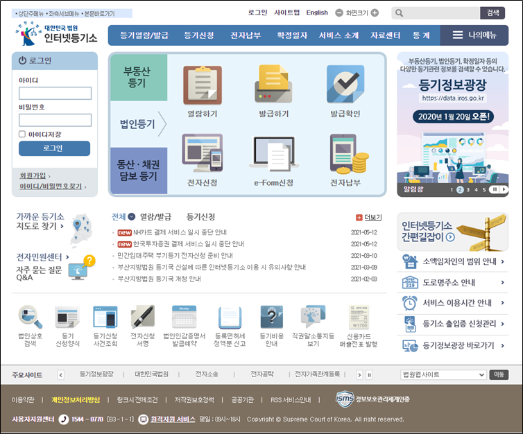 대한민국 법원 인터넷 등기소(http://www.iros.go.kr/)에서도 조회가 가능합니다.