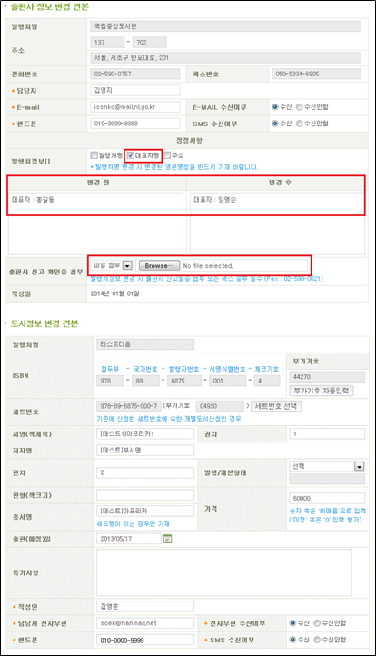 ISBN 발급 및 납본까지 완료된 이후에 도서정보나 발행처정보가 변경되면 정정 신청을 해야 합니다.