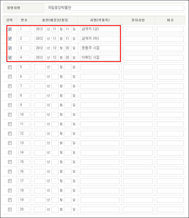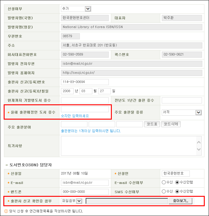 발행자번호 신청서와 연간출판 예정 목록은 서지정보유통지원시스템에서 직접 작성하면 되고, 출판사 신고확인증은 파일로 첨부하시면 됩니다.