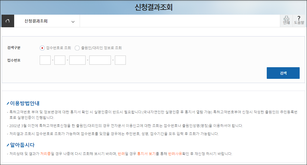 출원인 정보로도 조회는 가능하나 접수번호로 조회하는 것이 훨씬 빠릅니다.