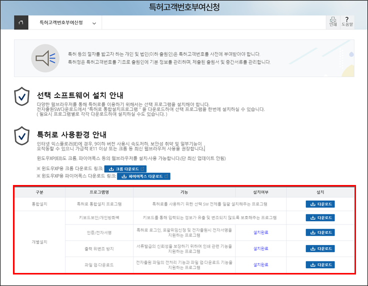 특허고객번호를 신청하려면 먼저 보안 프로그램을 설치해야 됩니다.
