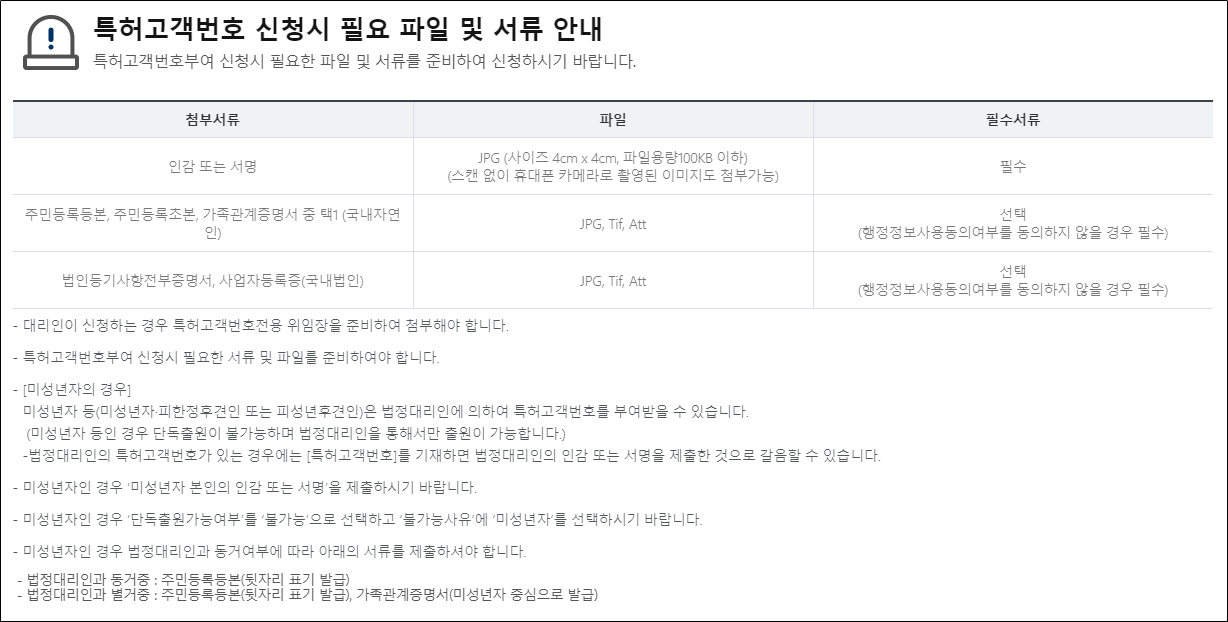 해당 페이지에서 스크롤을 좀 더 내리면 특허고객번호 신청 시 필요 파일 및 서류 안내가 나옵니다.