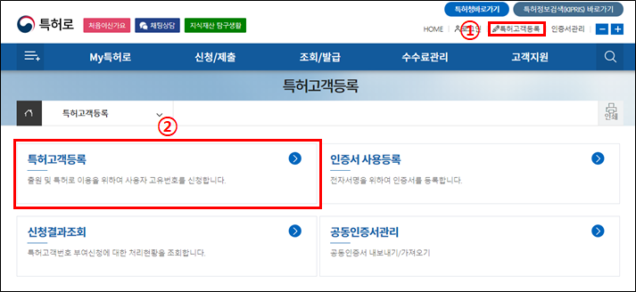 그 다음 중간의 [특허고객등록] 메뉴를 클릭합니다.