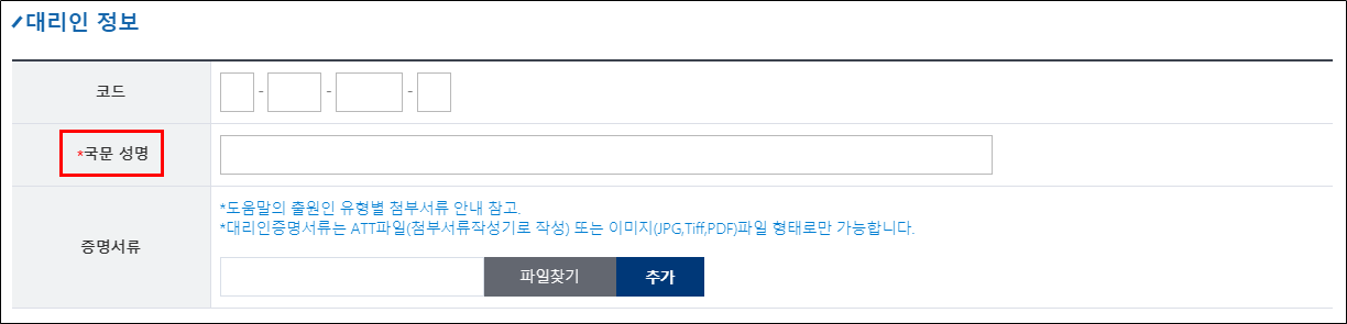 다만, [대리인 정보 > 국문 성명]에도 별(*) 표시가 되어있는데, 해당 항목은 입력하지 않아도 신청하는데 문제가 없습니다.