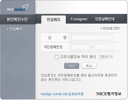 아래 스크린샷과 같은 본인확인 팝업이 발생되며, 성명/주민번호등록 입력 및 고유식별정보 처리 동의 후 확인 버튼 클릭하면 본인 인증이 완료됩니다.