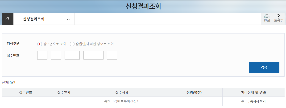 2일 후 [특허고객등록 > 신청결과조회]로 이동한 후, 접수번호 또는 출원인 정보를 입력하여 검색합니다.
